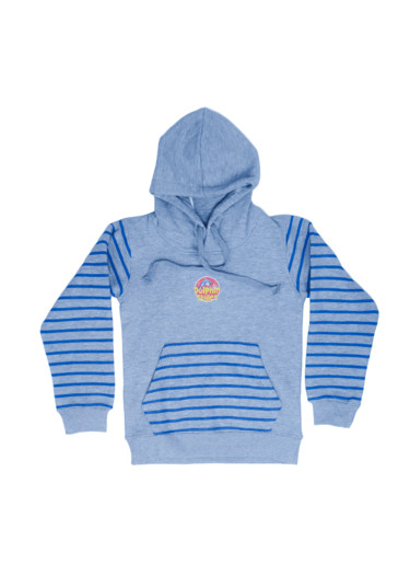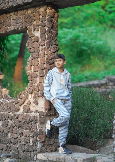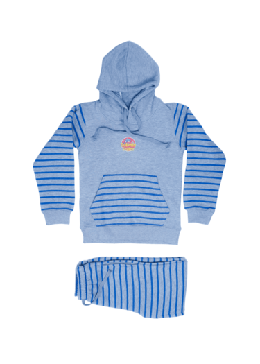 • Classic Striped Style: The light gray hoodie and matching joggers feature bold blue stripes, creating a timeless and stylish design. The small, circular emblem on the hoodie adds a pop of color.