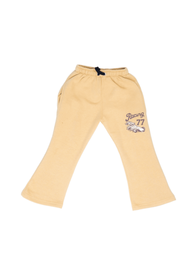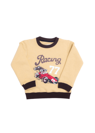 • Race-Ready Design: The tan sweatshirt features a vibrant graphic of a race car, with “Racing” and “77” printed in a classic font. The matching joggers also feature the same race car graphic.